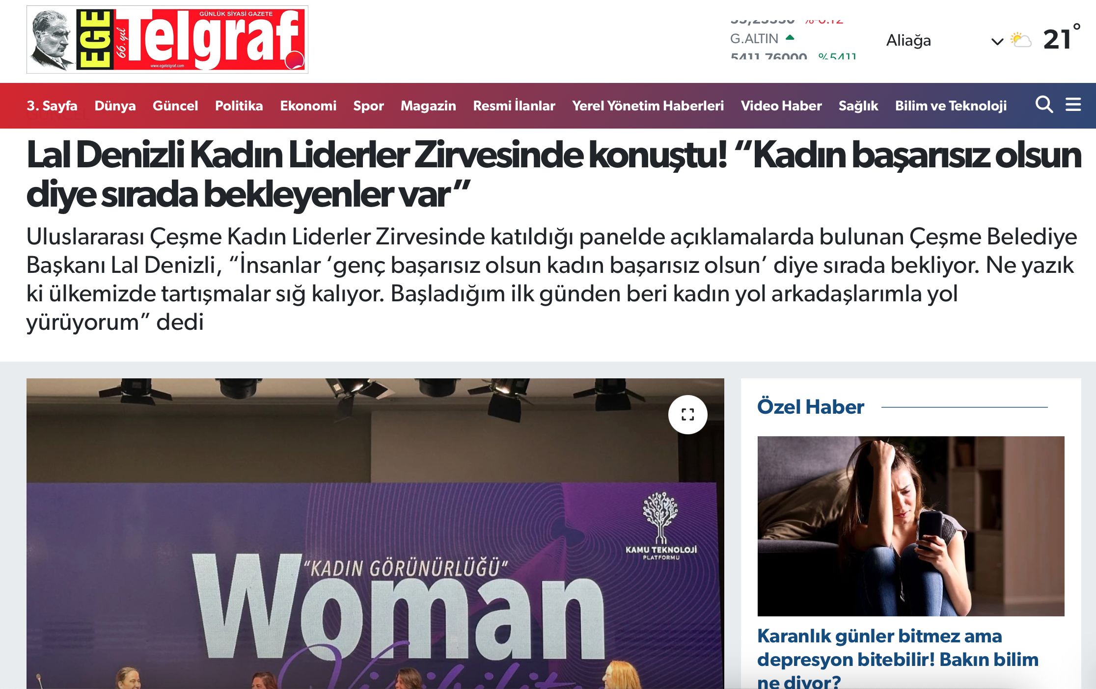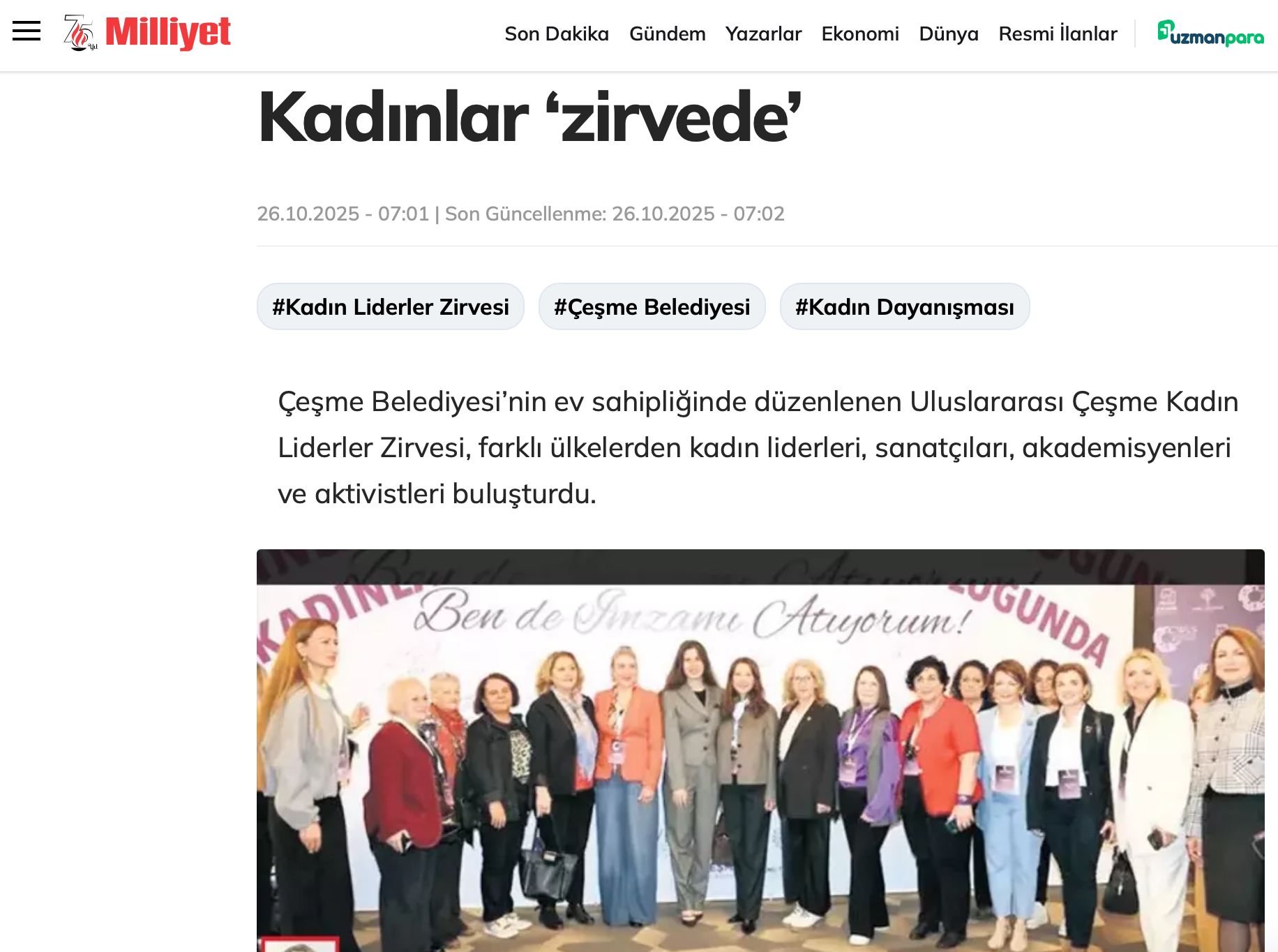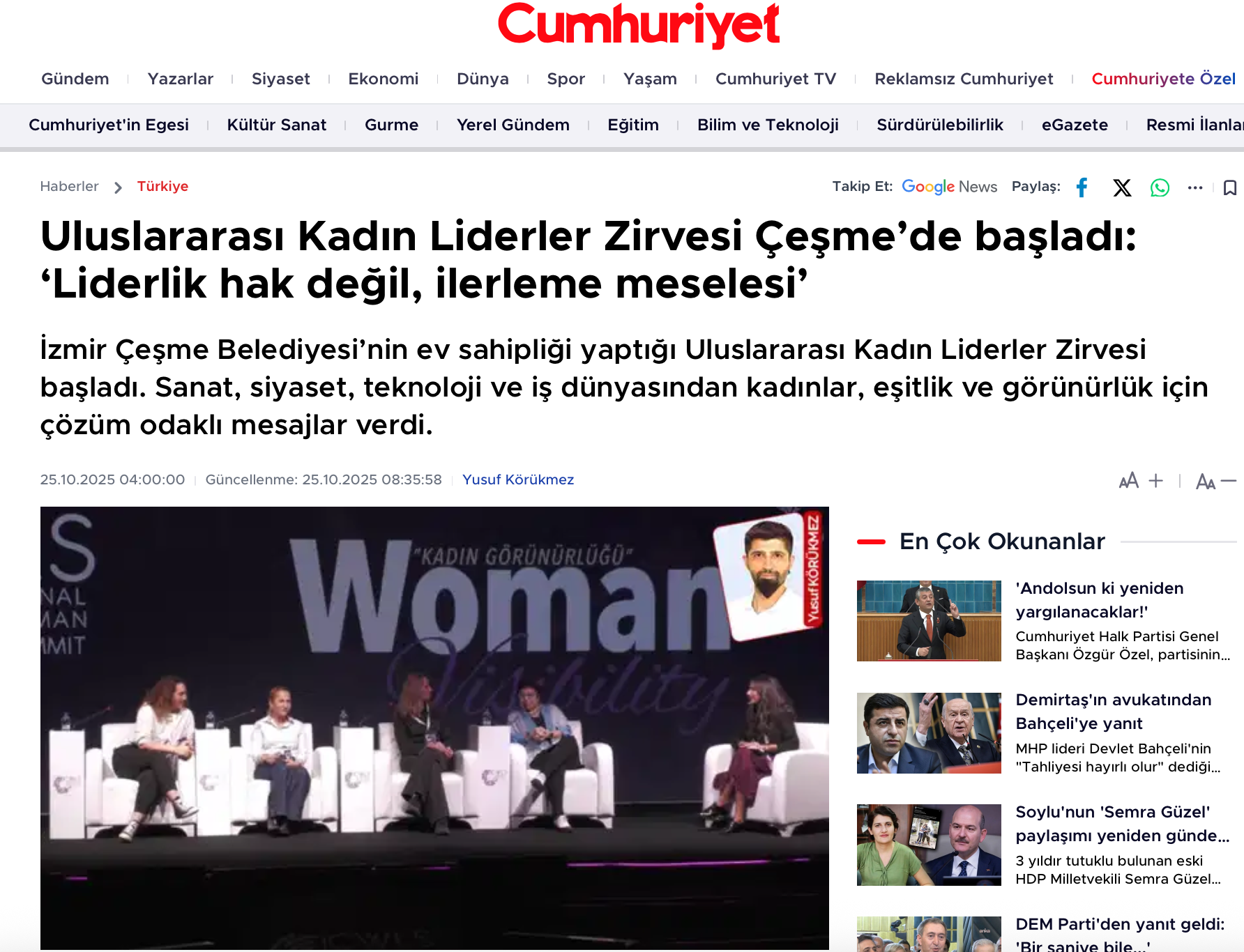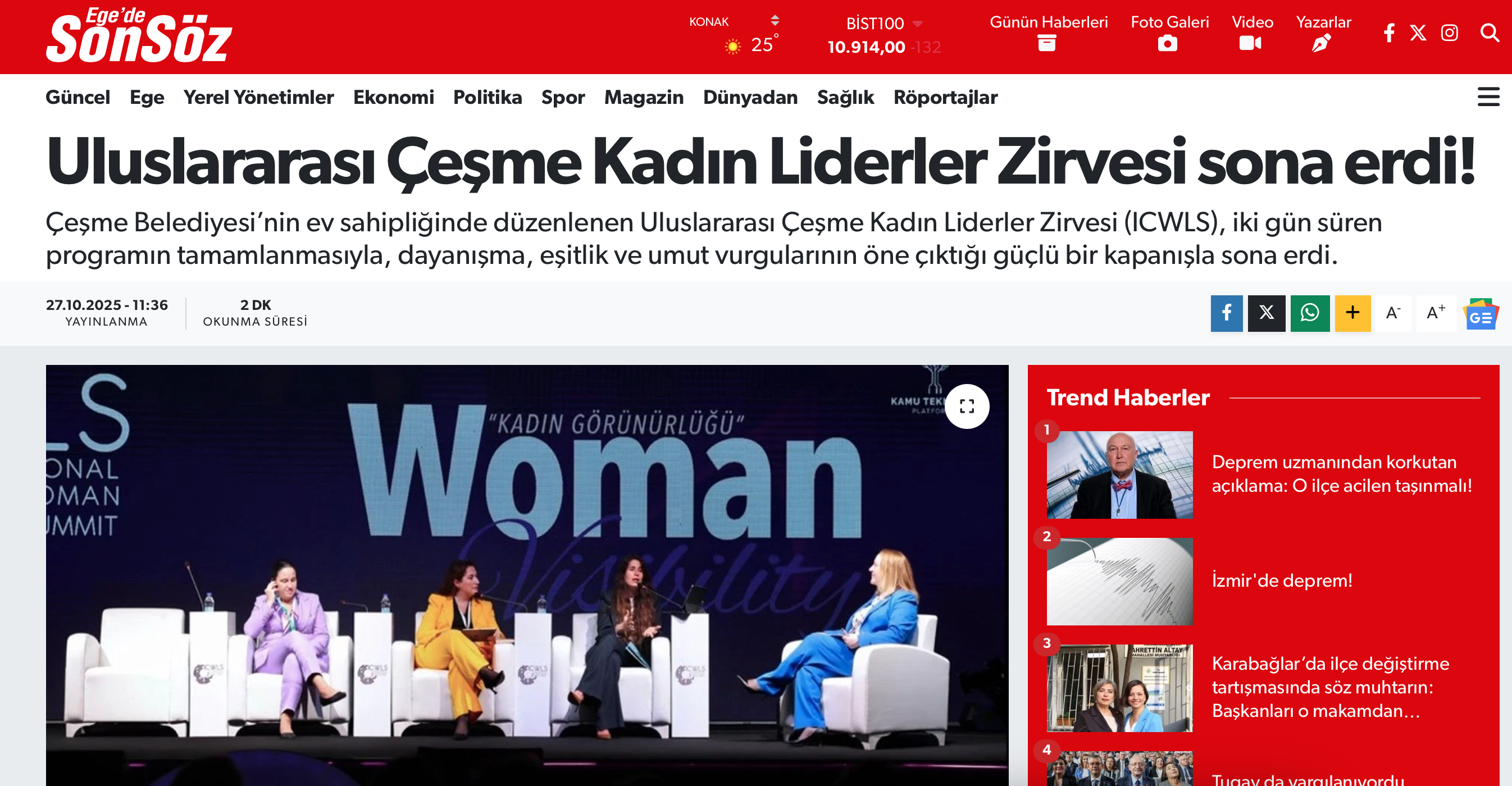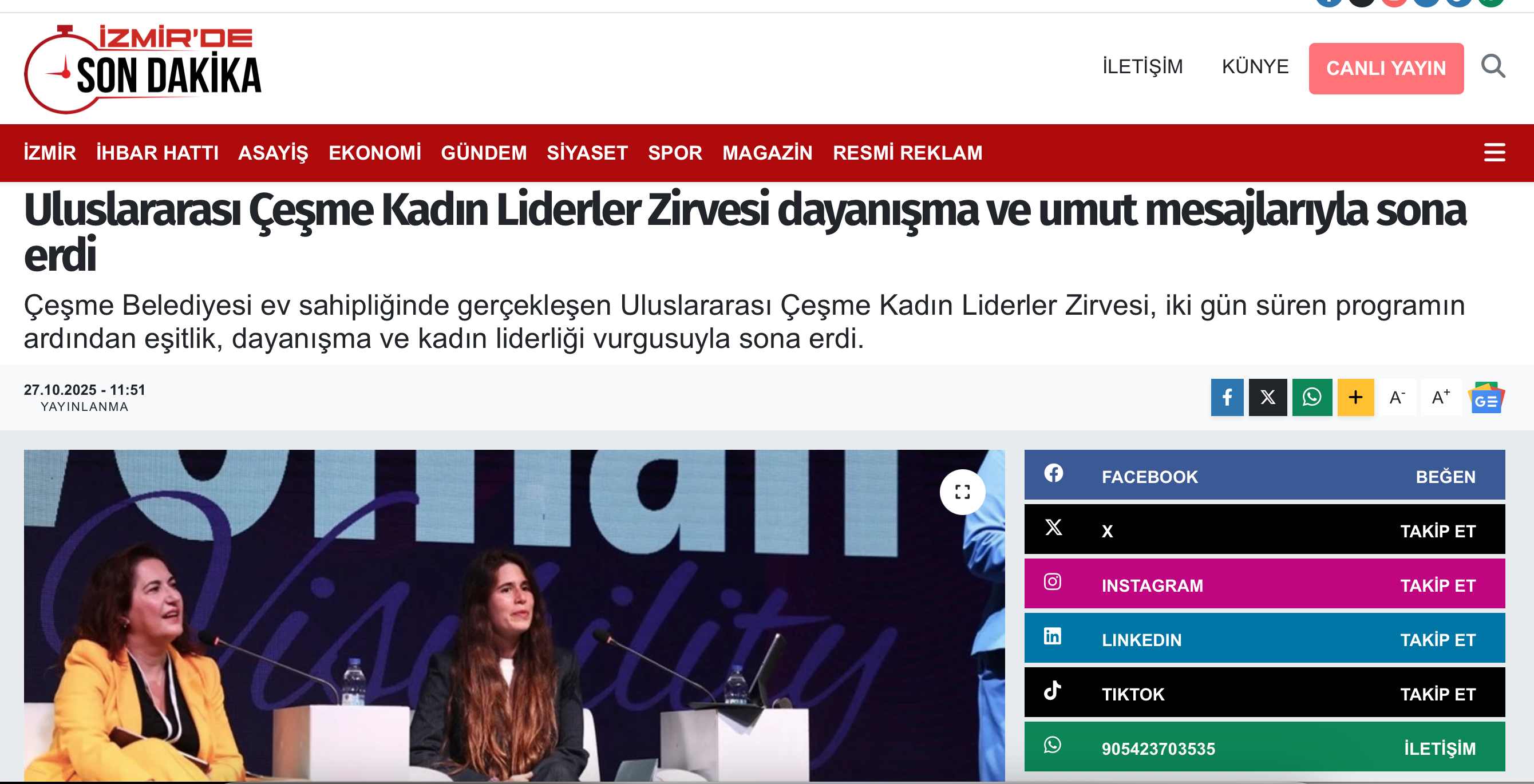 1. Uluslararası Çeşme Kadın Liderler Zirvesi, Çeşme Belediyesi ve Kamu Teknoloji Platformu işbirliğiyle 23-25 Ekim 2025 tarihlerinde düzenlenecek.
